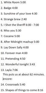 gig Sunday June 11th 2023 White Room:Badge-by-Cream-1-1 guitarSunshine of Your LoveStrange brewI Shot The SheriffMiss YouCocaineAfter Midnight_Mash Slow FirstLay down SallyVIDEO_Forever-ManPretendingWonderful TonightLayla-VIDEO BREAKCrossroadsShapes Of Things (Live In Detroit,USA⧸1984) Click on Dan for directions