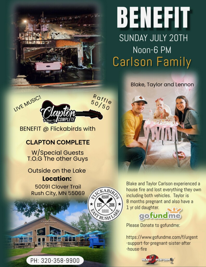 SET LIST,July 20th, 2025 BENEFIT Carson Family Rush City, MN VIDEO_Forever-ManBlues Power-VIDEO BREAKSunshine Of Your LoveWhite Room-VIDEO BREAKStrange brewBadgeCant findWay-Home_VIDEO BREAKBell-Bottom-BluesLayla-VIDEO BREAKLay down SallyThe CoreI Shot The SheriffWonderful TonightCocaineMiss YouPROMISESPretendingcrossroads-TALK BREAKLet It Rain